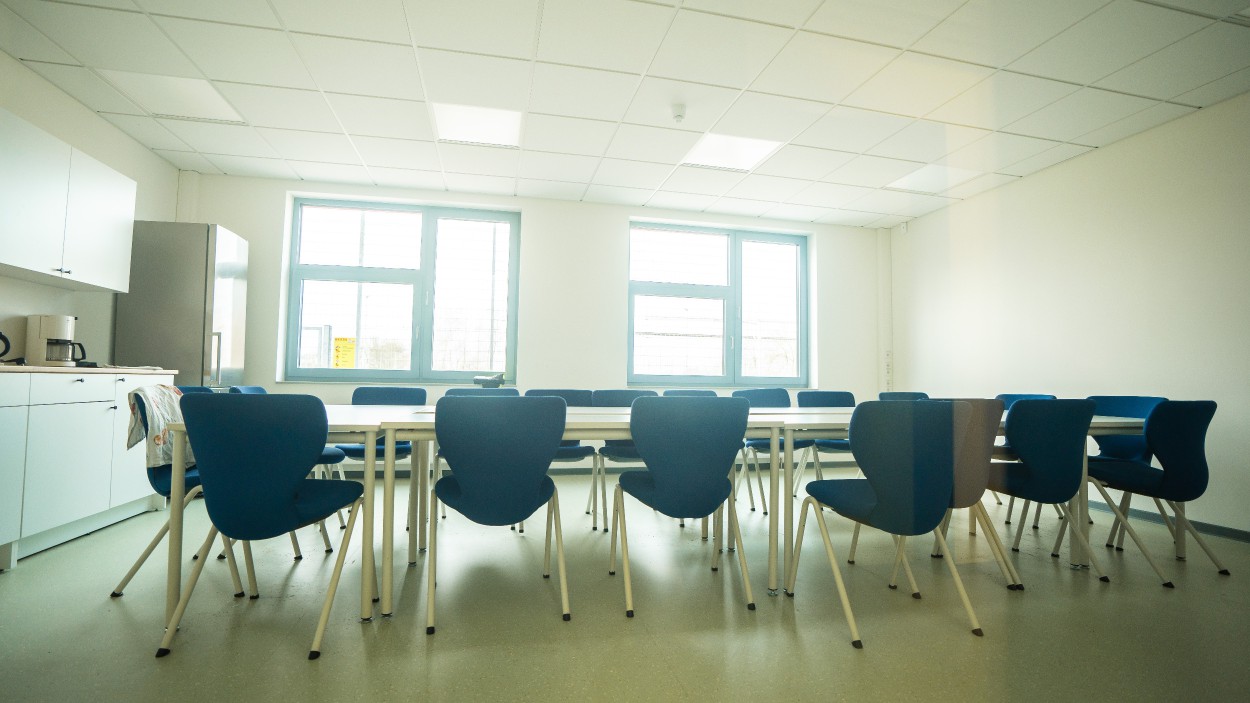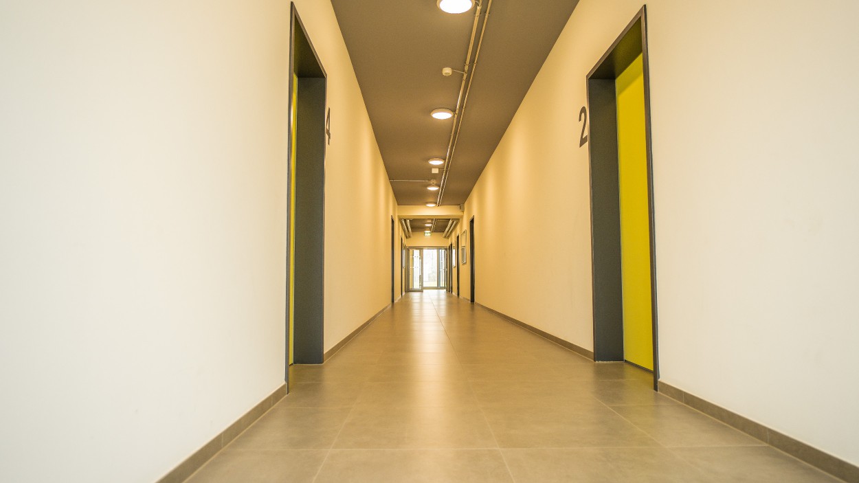 Beide Gebäudebereiche sind untereinander über einen zentralen Mittelflur barrierefrei verbunden und werden durch eine Türanlage voneinander abgegrenzt. Der gesamte Innenbereich ist schwellenlos geplant.