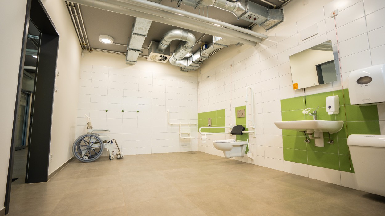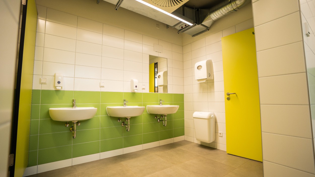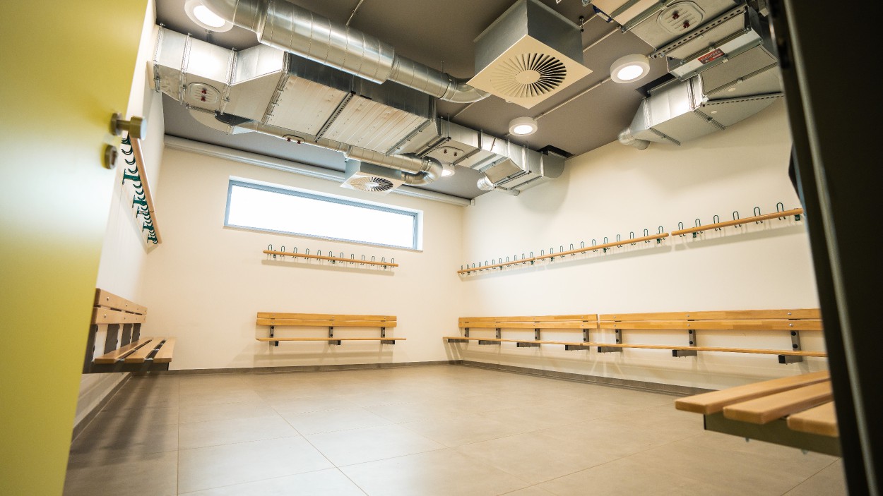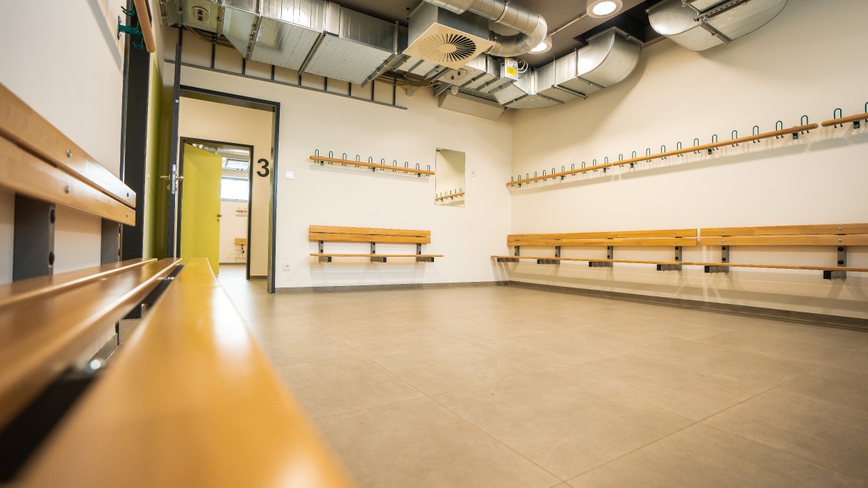 Im östlichen Flügel befinden sich die Umkleide- und Sanitärräume für Sportler ohne Handicap sowie ein Schiedsrichterraum.