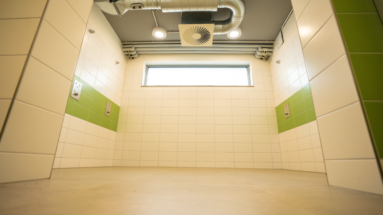 Die Funktionsräume für Waschen/Trocknen sowie Lagerräume sind eingangsnah und im Verschneidungsbereich der Gebäudeteile angeordnet.