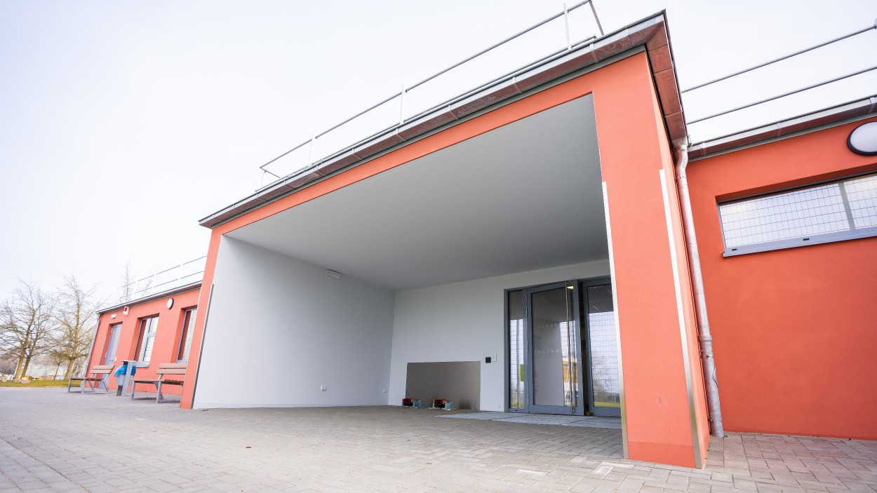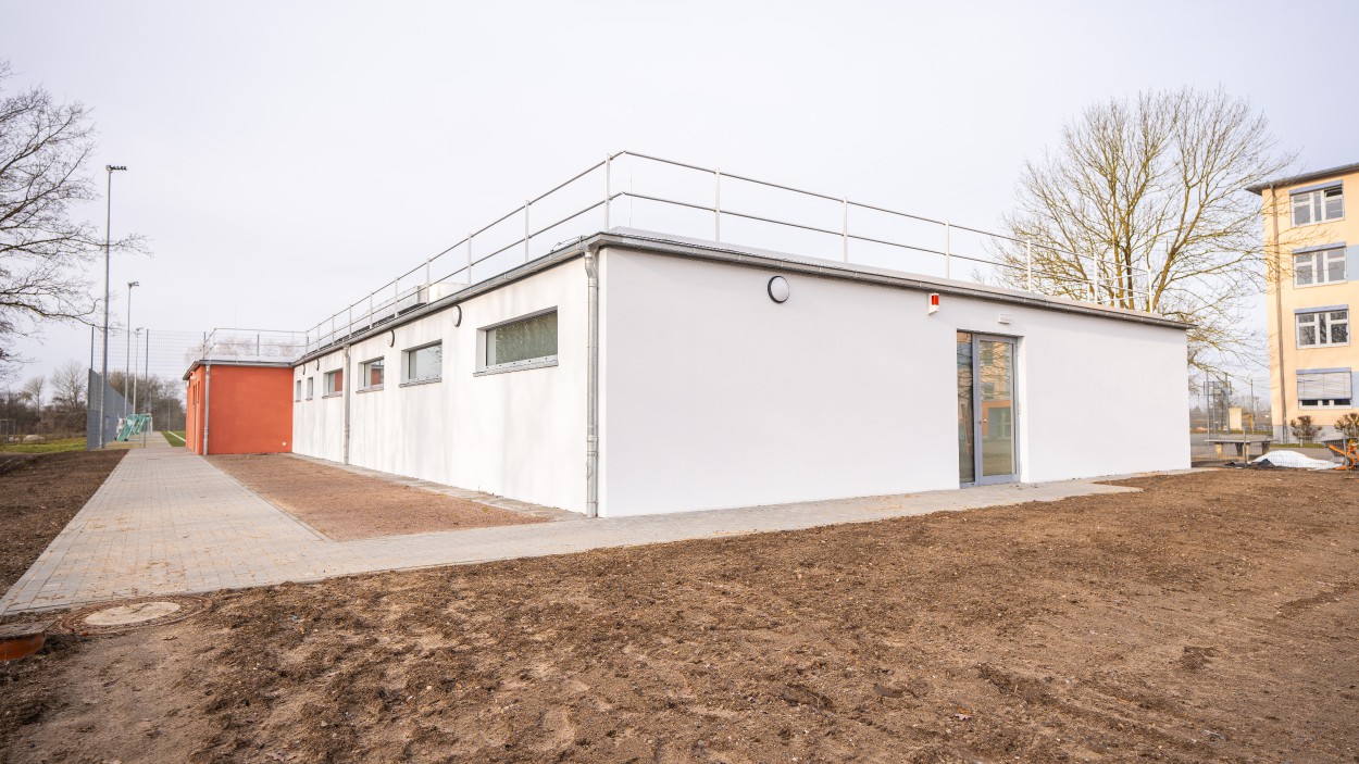 Im südlichen Teil des Hauptgebäudes sind ein Außengerätelager und die Außensanitärbereiche für Zuschauer und Sportler gut erreichbar untergebracht.